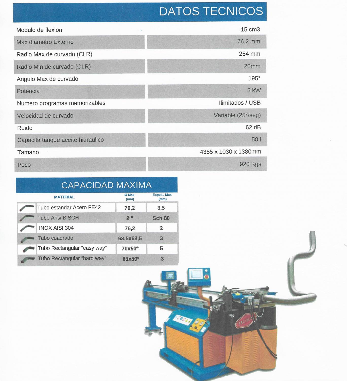 Cabezal de curvado patentado en arrabio esferoidal GS500. Sistema de mordaza patentado con auxiliar de estabilización de la presión hidráulica del patín. Extracción antocipada del mandril a través de cilindro hidraulico y varilla pasante Eje C de curvado programable y posicionamiento del carro mandril de manera manual a 2 ejes. Con encoder de elevada resolución y topes mecanicos estandars regulables. 2 pantallas digitales sincronizadas: una para visión digital del avance y rotación del carro mandril, y uno con puerto USB para programación y control del eje C de curvado.
