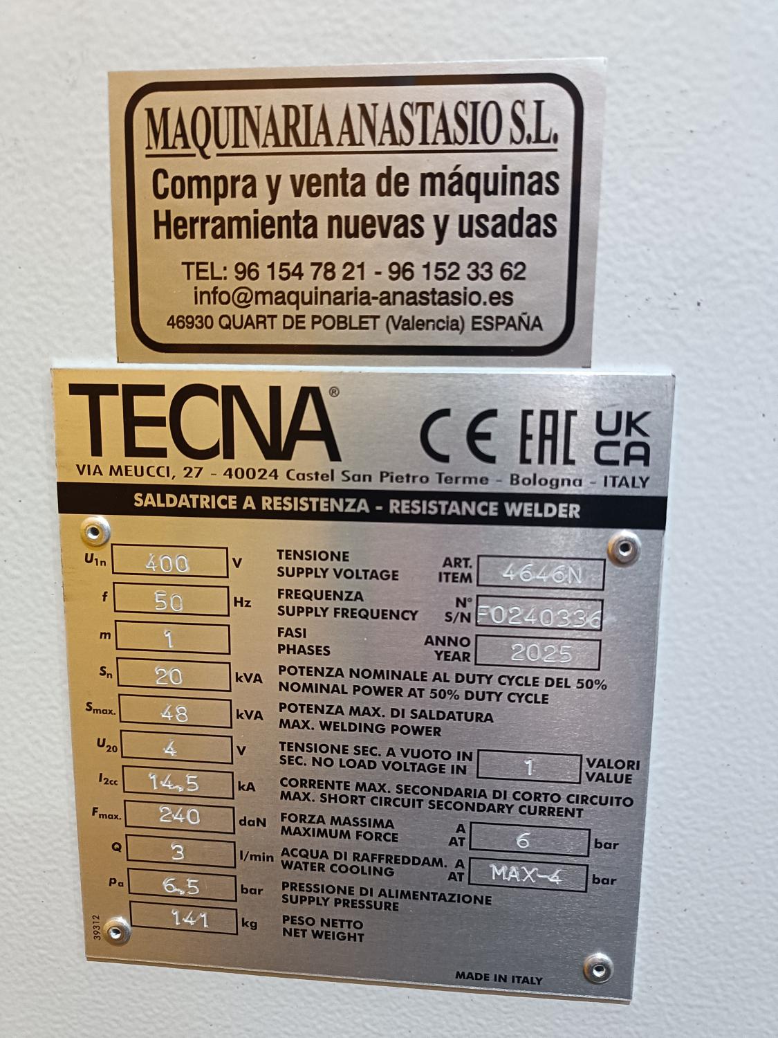 SOLDADURA A PUNTO TECNA. Mod. 4646N. 20KWA-380V. ACCIONAMIENTO NEUMATICO CON CONTROL ELECTRICO DE SOLDADURA. CAPACIDAD MAXIMA 4+4, 12+12 VARILLAS. LONGITUD DE BRAZO 550 mm. PESO: 141 KG. DIMENSIONES: 1414 X 408 X 700 mm. NUEVA.
