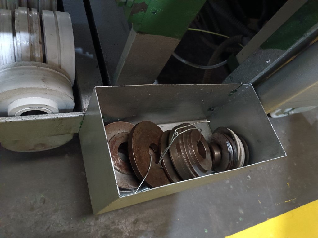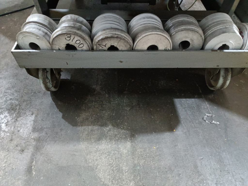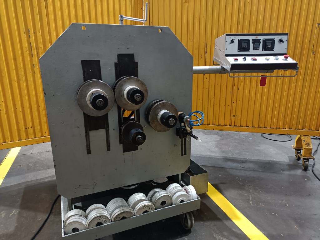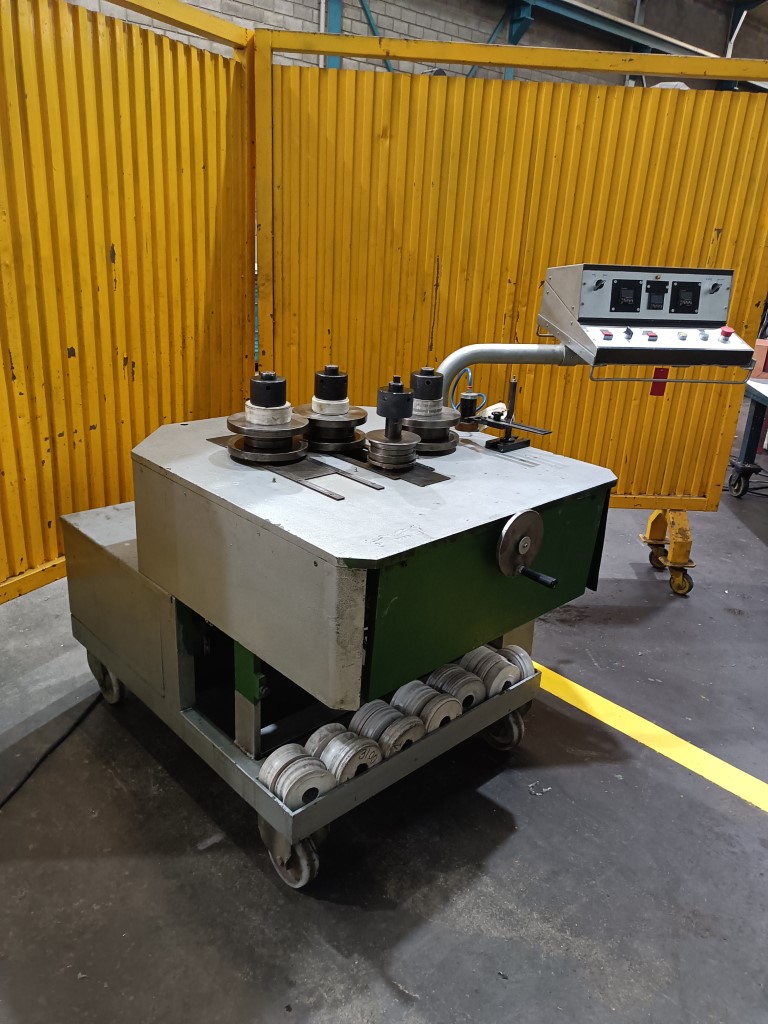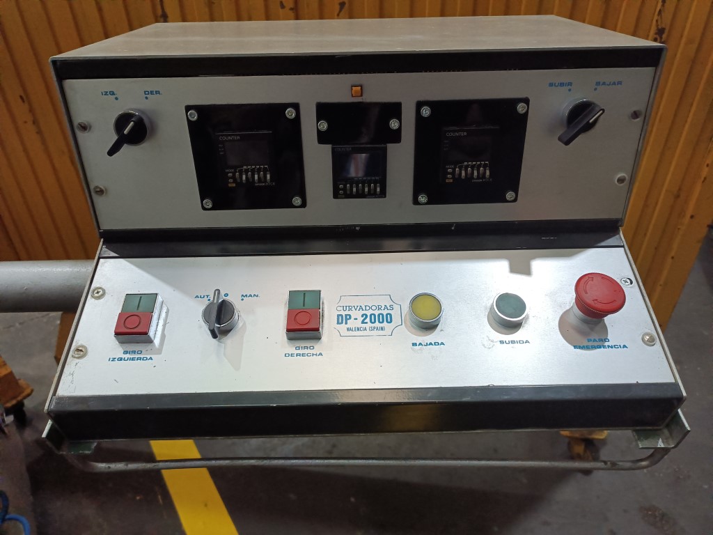 CURVADORA DE PERFILES DOMINGO PARRA, mod. DP-2000 , capacidad hasta 100 mm ancho, 50mm angulo, 100 x 1.5mm pletina. Año 2000. Con varios juegos de rulinas en acero Nylon, especialmente diseñada para el curvado de perfiles especiales, con eje de Ø40, con 4 ejes, 3 de ellos matrices, con posicionador electronico en dos de ellos y encoder de medición de longitud perimetral interna de la curva. Fuerza de curvado hidráulica, inclinable 90º, con ruedas robustas para traslado a obra. en muy buen estado, 3 motores 1,5Hp a 380V. USADA.