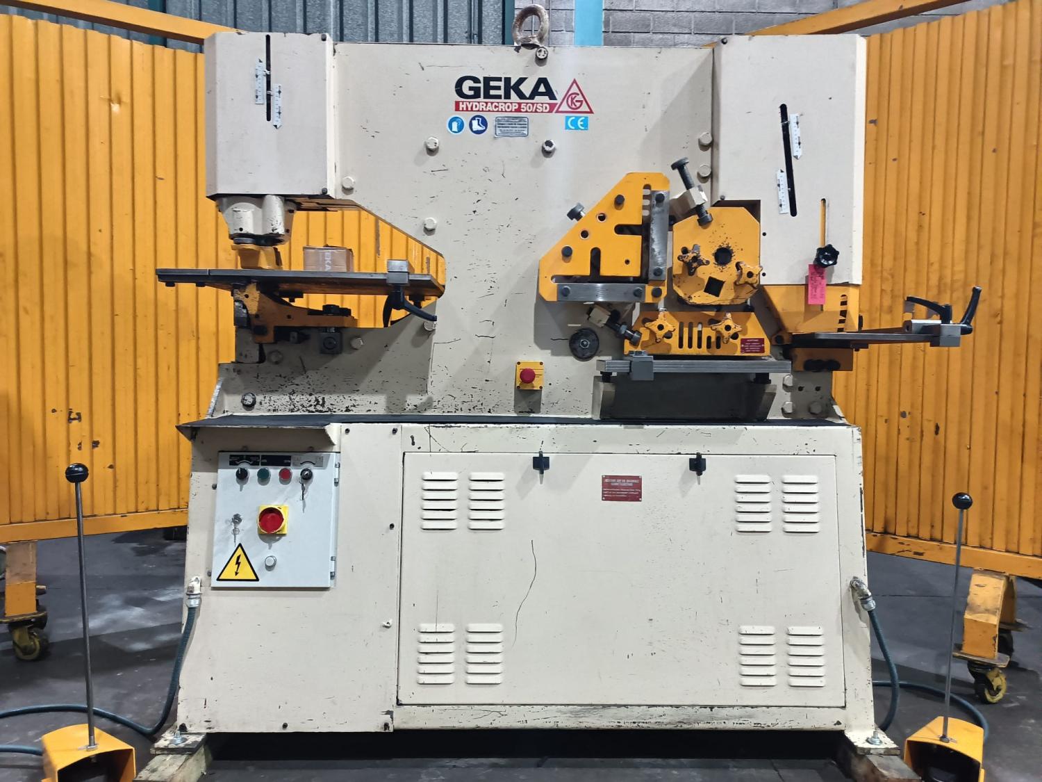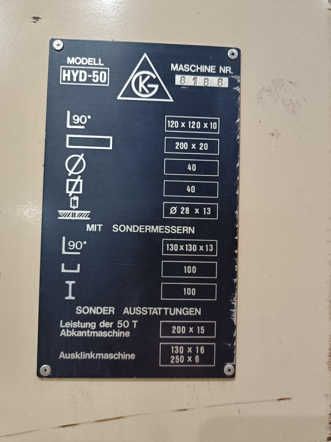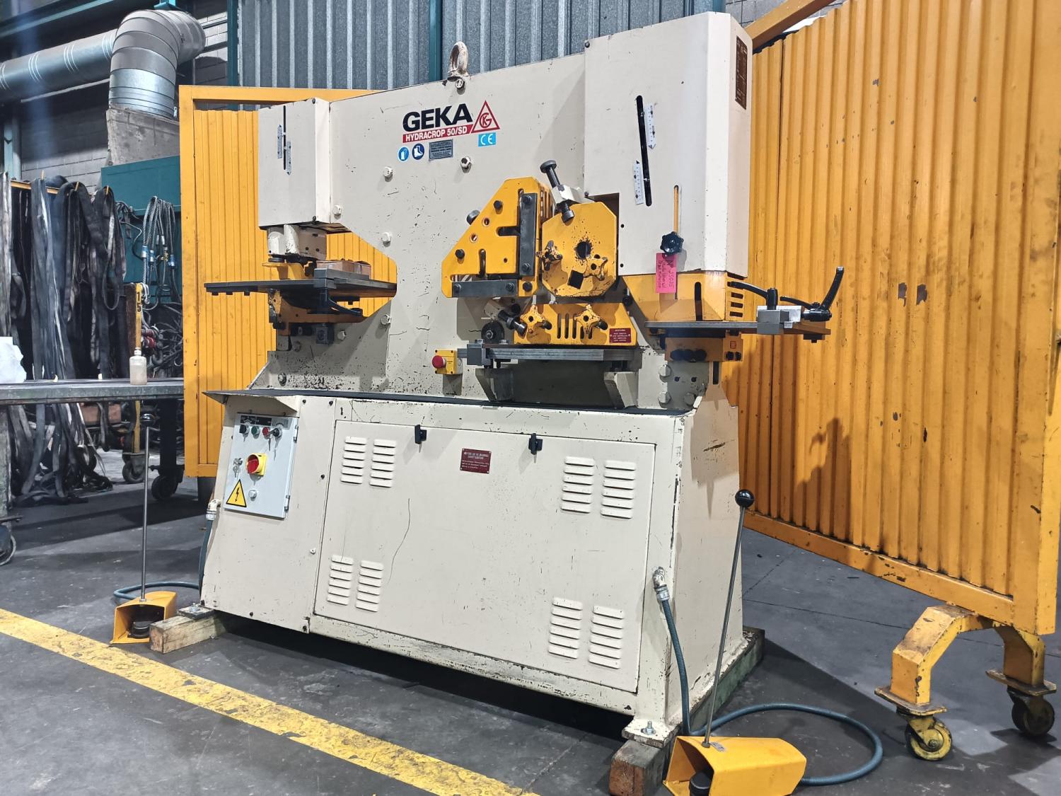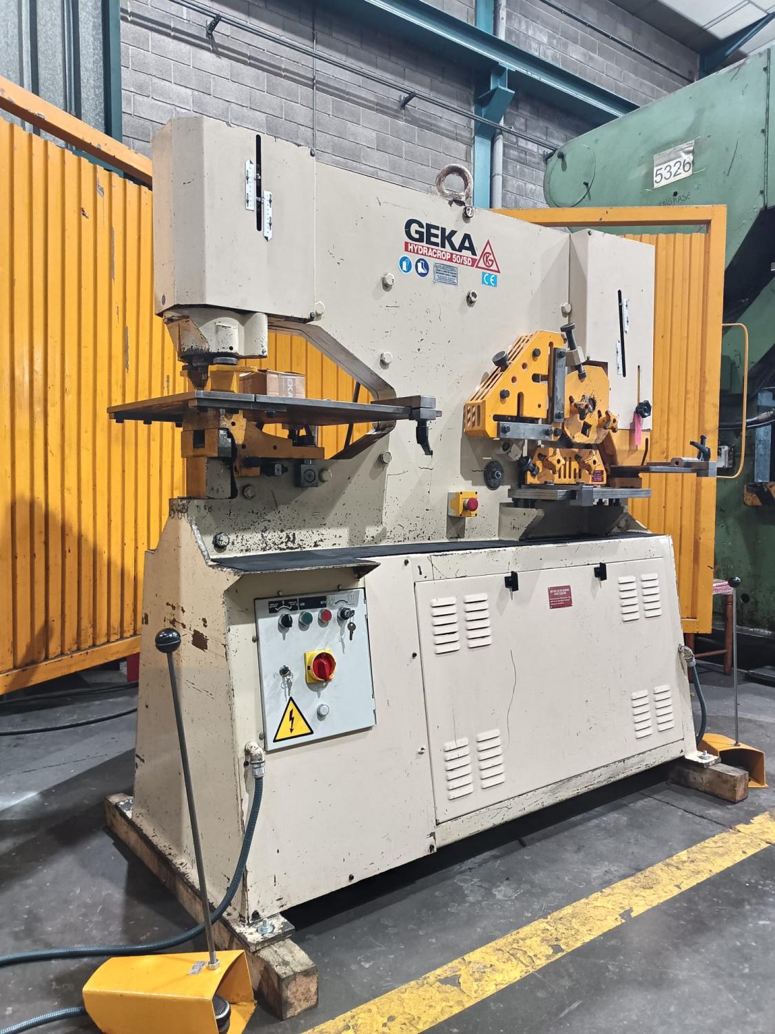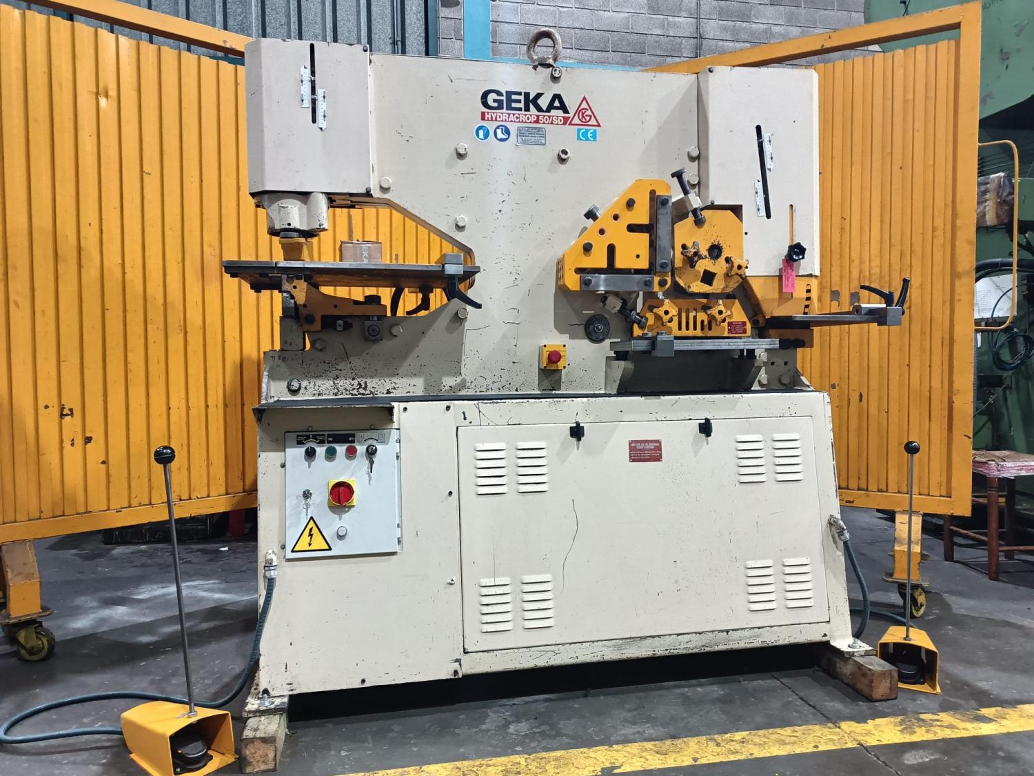 CIZALLA UNIVERSAL Marca: GEKA-Hydracrop-50 SD. Motor: 7,5 Hp. Capacidad: Punzonado Ø40 x 10 mm ó Ø20 x 20 mm L de 120 x 120 x 10mm, Ø40 pletina 200 x 15mm. Año Fabricación: años 90 aprox. Pais Origen: ESPAÑA. Control: Convencional. Accesorios: con escote de 500 mm, en mesa de punzonado, tope electrico de 1 m de longitud, topes en mesa de punzonado y escantonado, con sello CE. 2 cilindros y 2 pedales de accionamiento. Dimensiones: 2 x 0,8 x 1,9 m. Peso1460 Kg. USADA.
