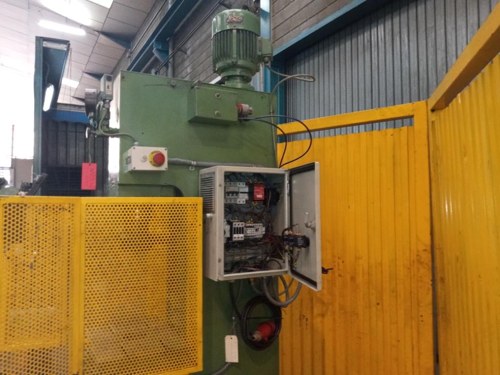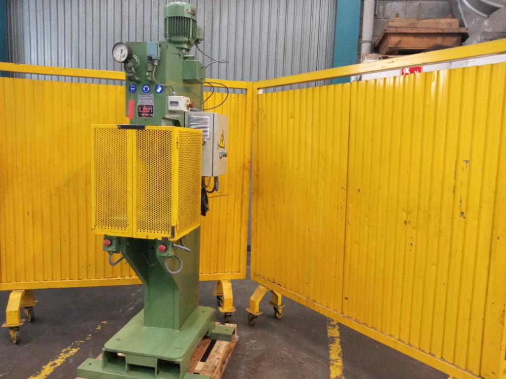 Con disparo a dos manos homologado, protección en zona de trabajo, cuentagolpes, parada de emergencia, persostato adecuado a RD 1215/97,