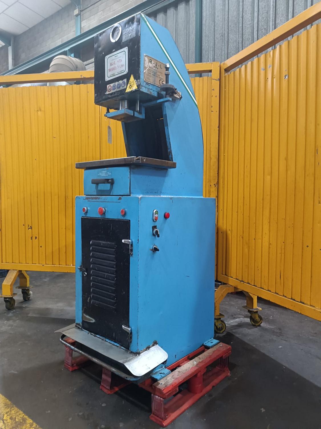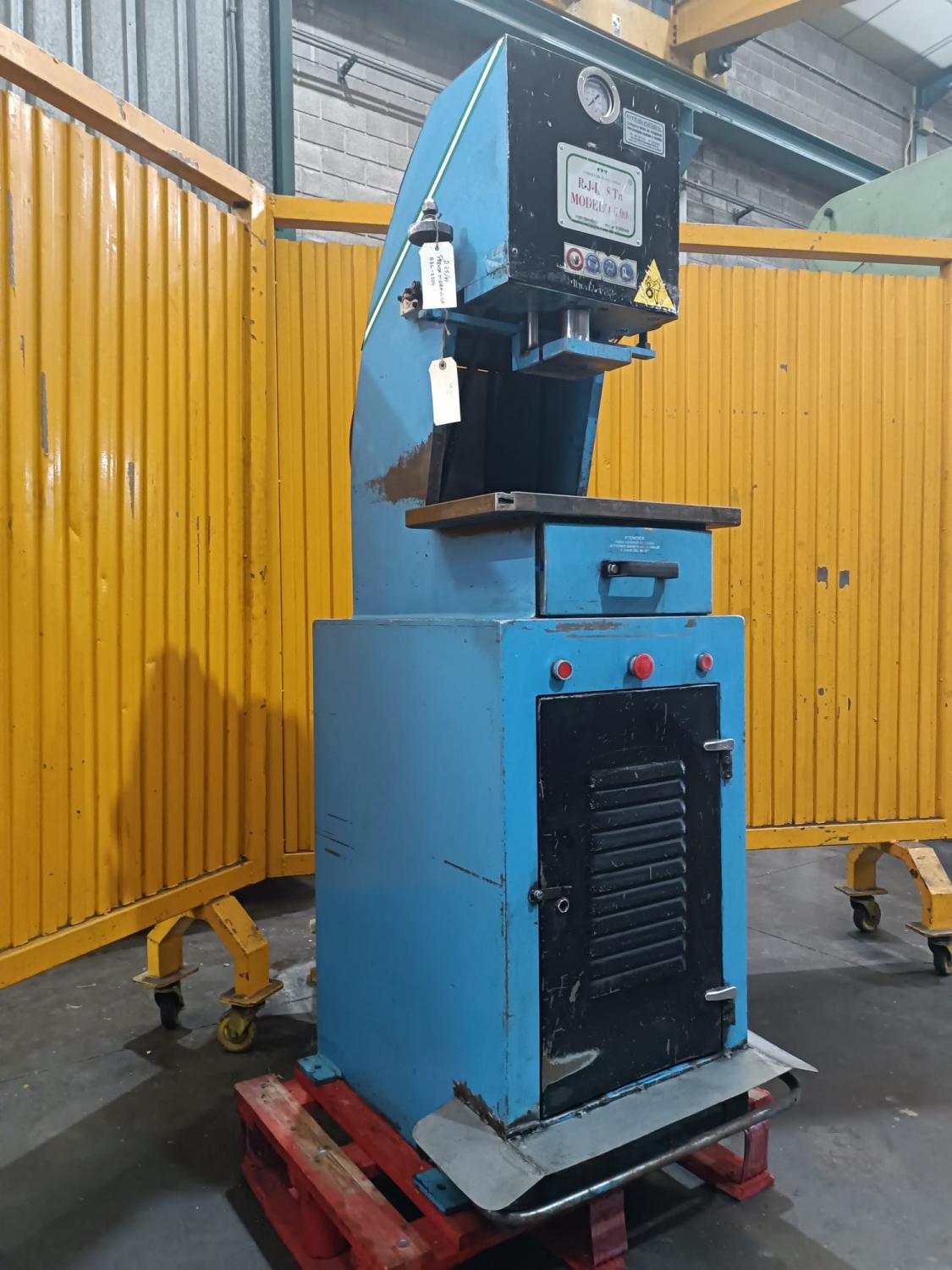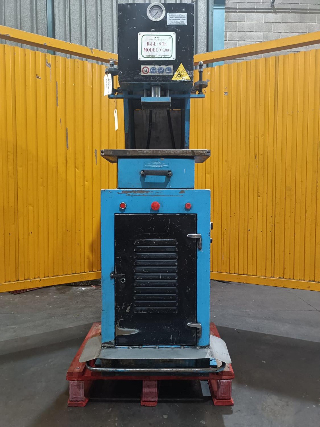 PRENSA HIDRAULICA Cuello de cisne, Marca: R.J.L. 8 Tn, Motor: 4 HP a 380 V, Pais Origen: España, Mesa: 500 x 400 mm, Peso: 400 Kg, Luz: 250, Recorrido: 100 mm, Altura de mesa: 1020 mm. Dimensiones: 660 x 730 x 1700 mm. OCASIÓN.