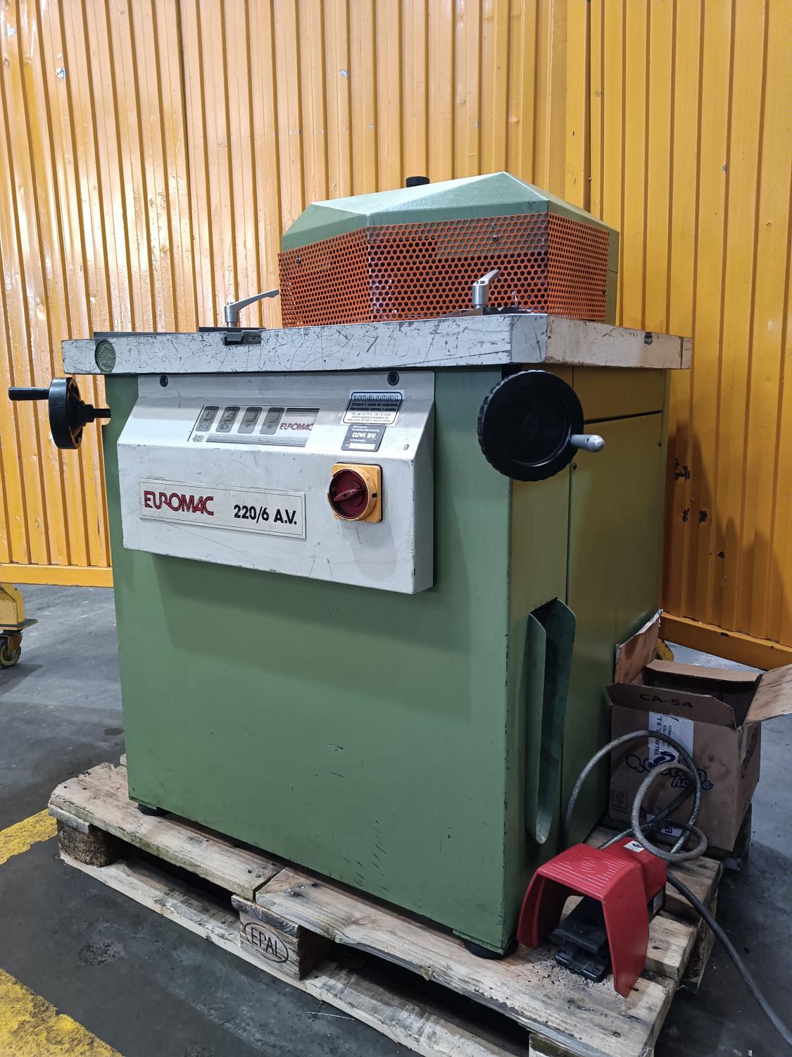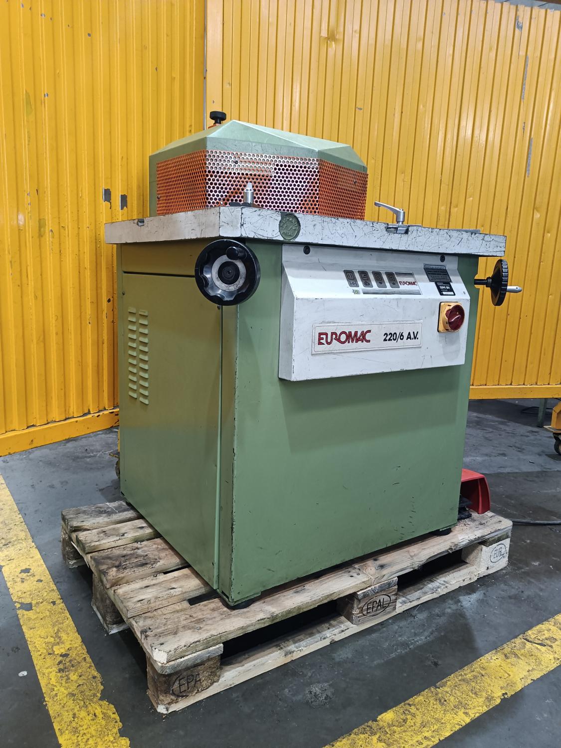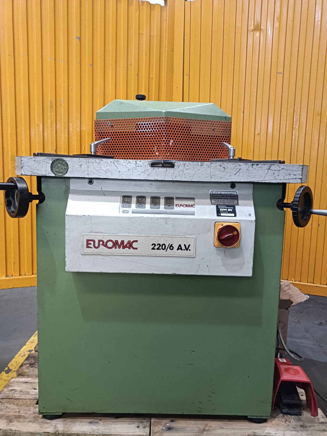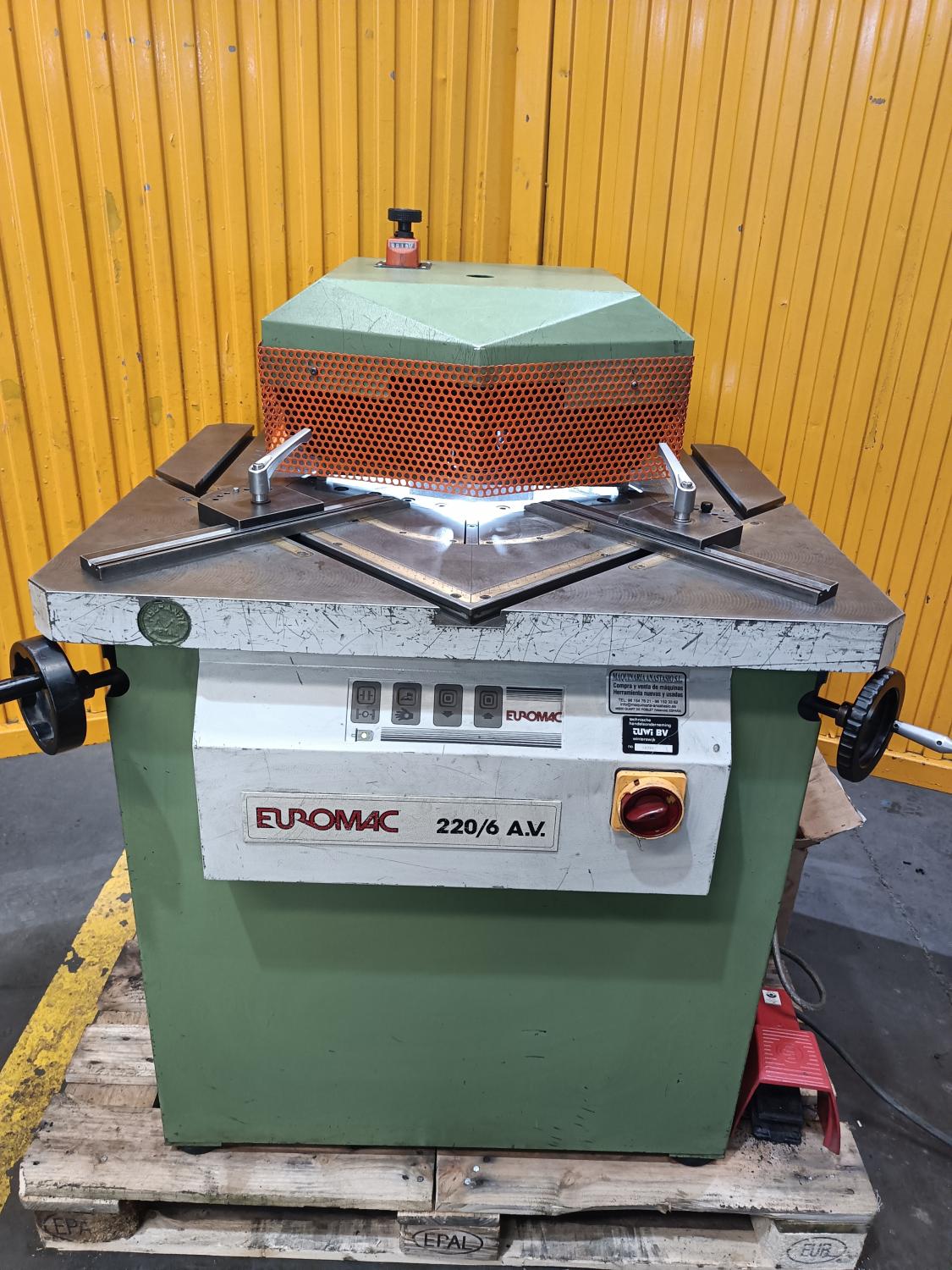 Hydraulic with variable angle Notcher, EUROMAC 220/6 AV. Motor: 4HP at 380 V. Capacity: 220 x 6 mm. Country of origin: Germany. Accessories: 10 spare blades. Dimensions: 850 x 950 x 1150. Weight: 750 kg