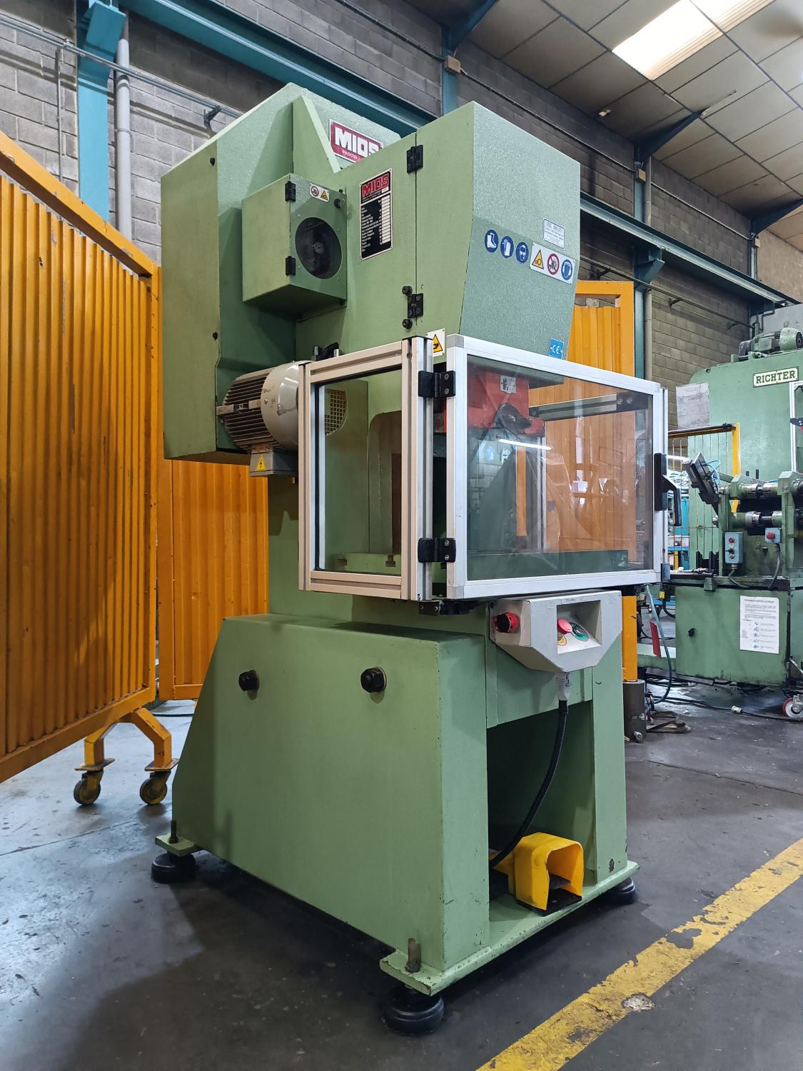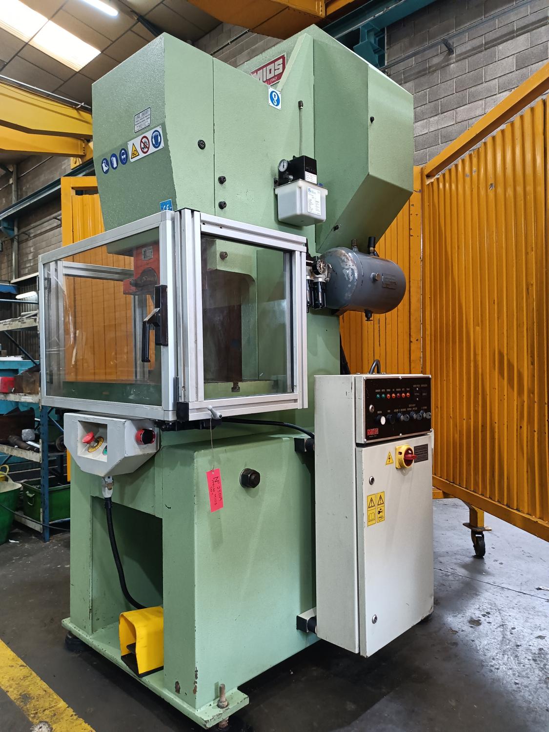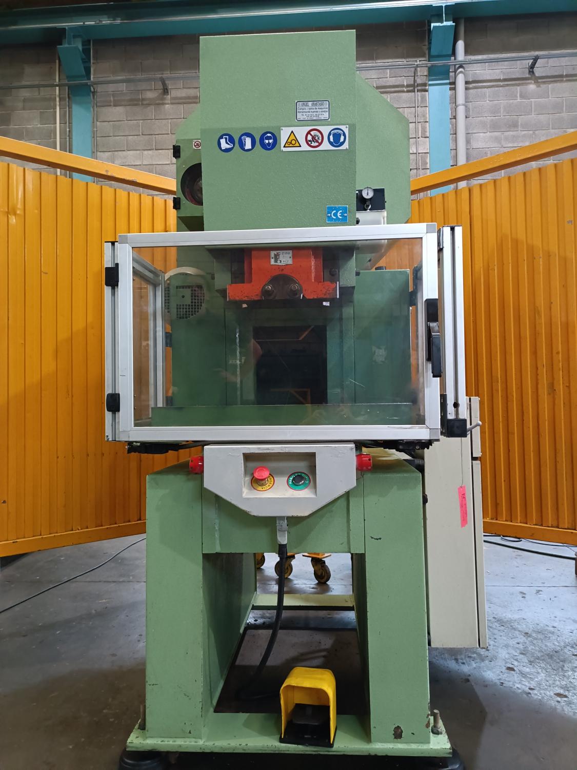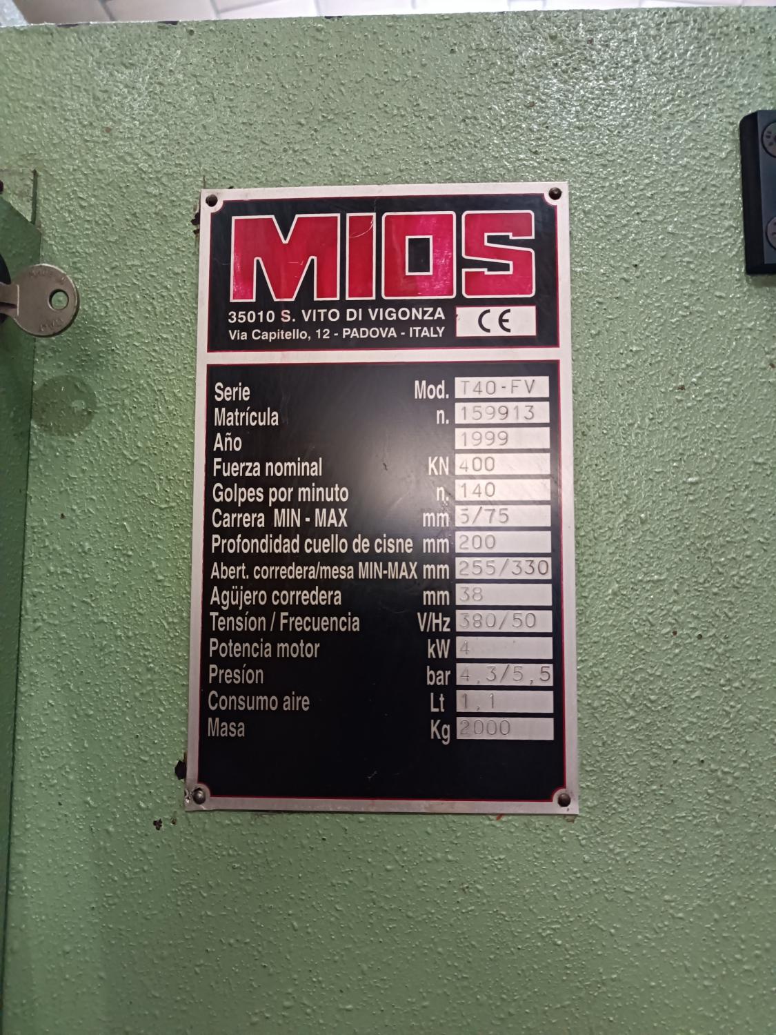PRESS EXC. PNEUMATIC CLUTCH Brand: MIOS Engine: 5 Hp. A 380V Year of manufacture: 1999. Tons: 40 T. Country of origin: ITALY. Stroke/min: 140 Light: 330 mm. Courses 5-75, Neck 200. Hole in table 120. Table: 670 x 410 mm Hammer surface: 320 x 140. Table height 900 mm. Weight: 2000 Kg. Dimensions: 1200 x 1100 x 2200 mm. Accessories: Perimeter fence table. CE marking and instruction book.