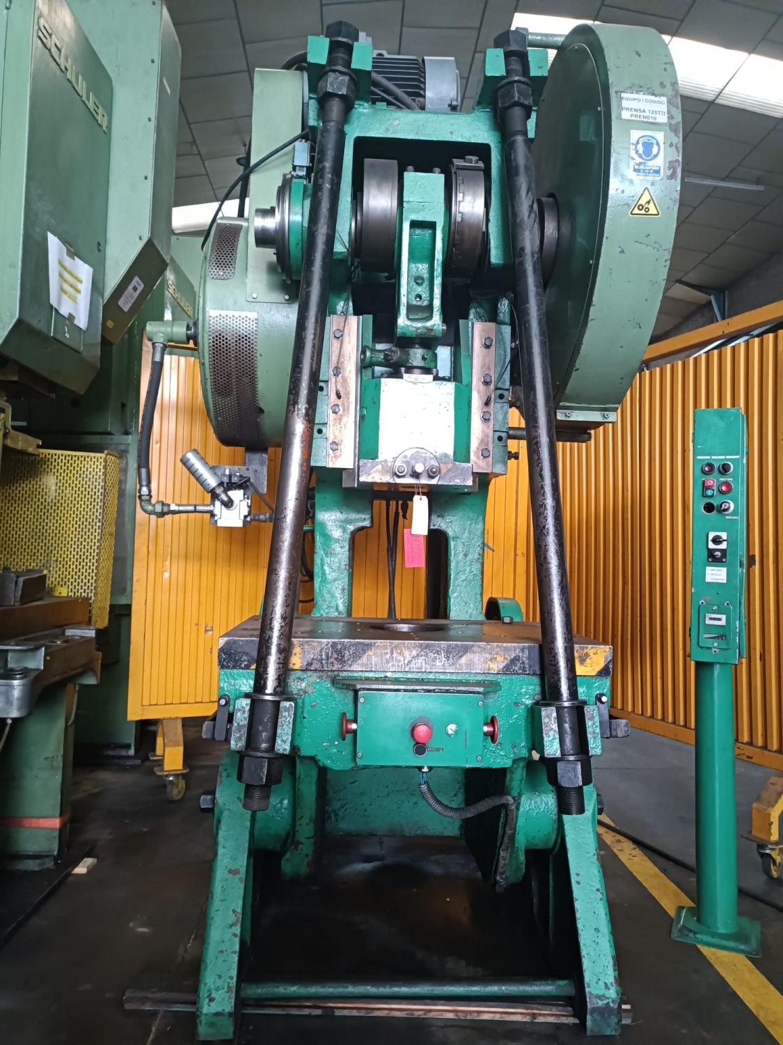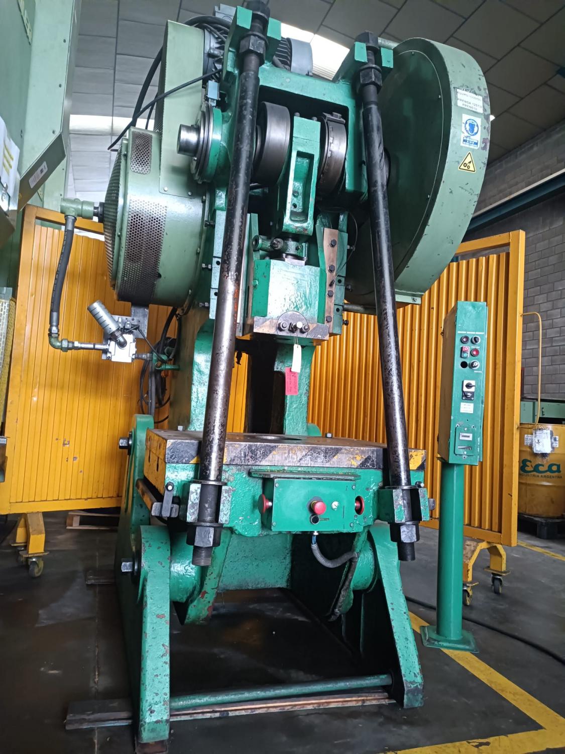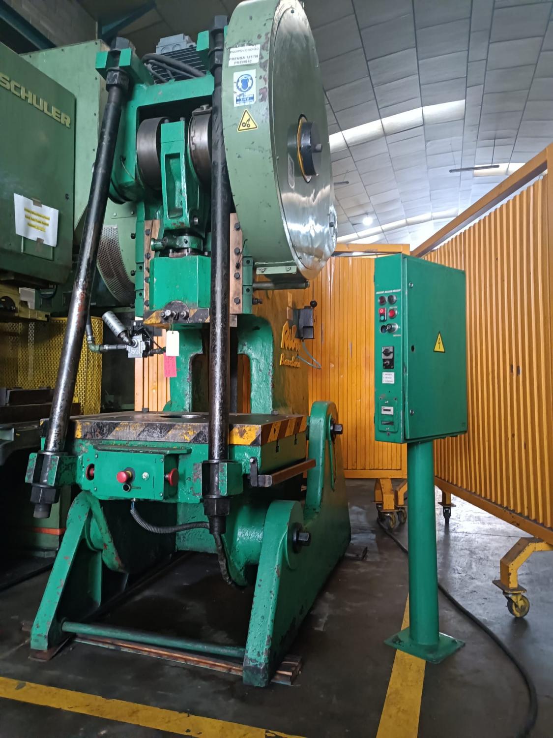 RIBA 125 Tilting Eccentric Press, 900 x 660 mm table, 500 mm span, 18/155 mm stroke, pneumatic clutch-brake, 10 HP motor, two-hand release, safety braces, grease pump, cast steel body. Dimensions 1.6 x 2 x 2.7 m. Approximate weight 10 tons. In very good condition. Chance.