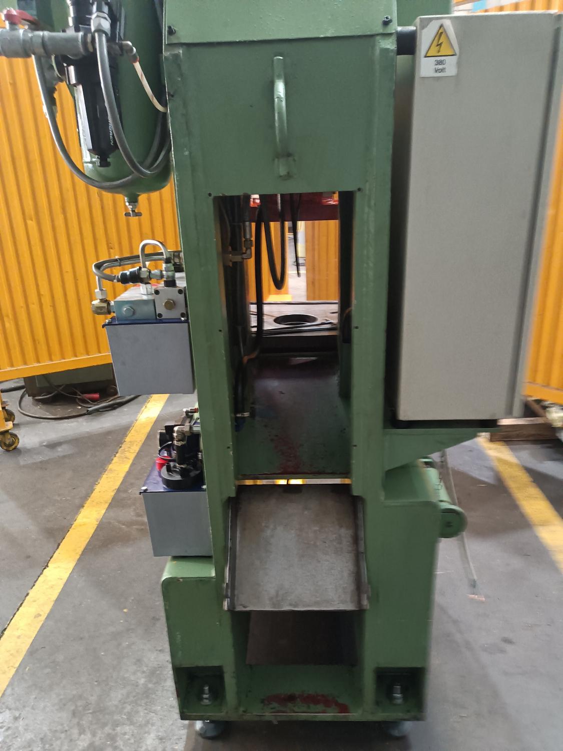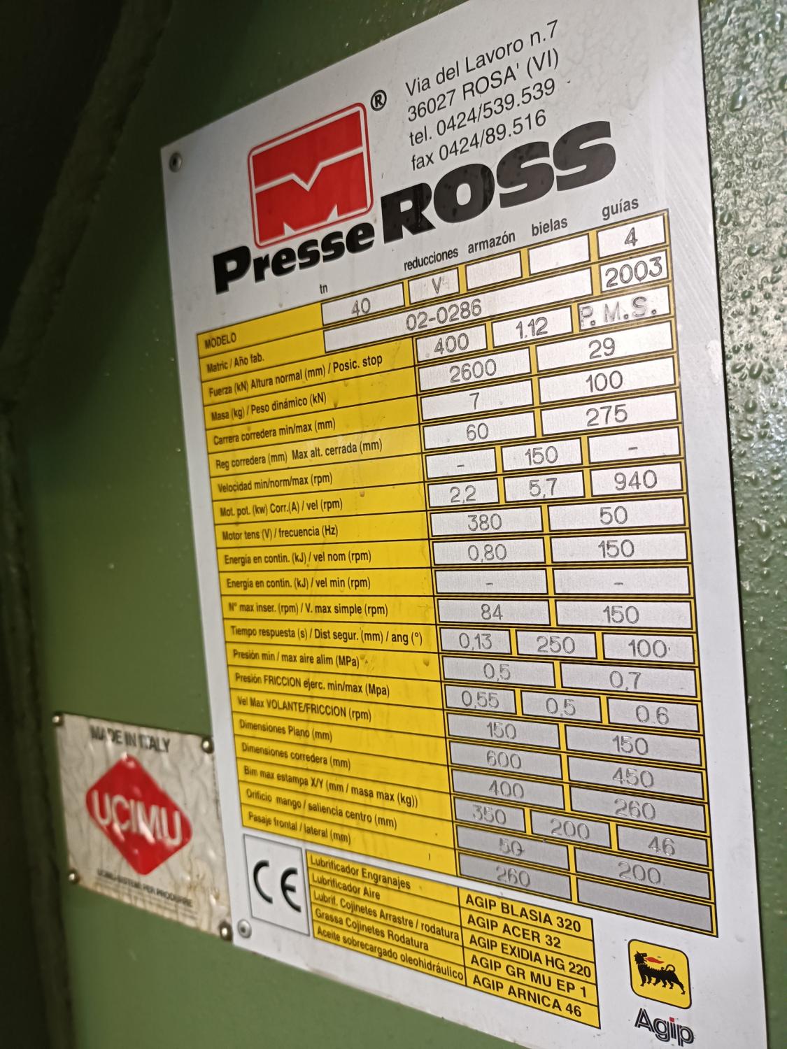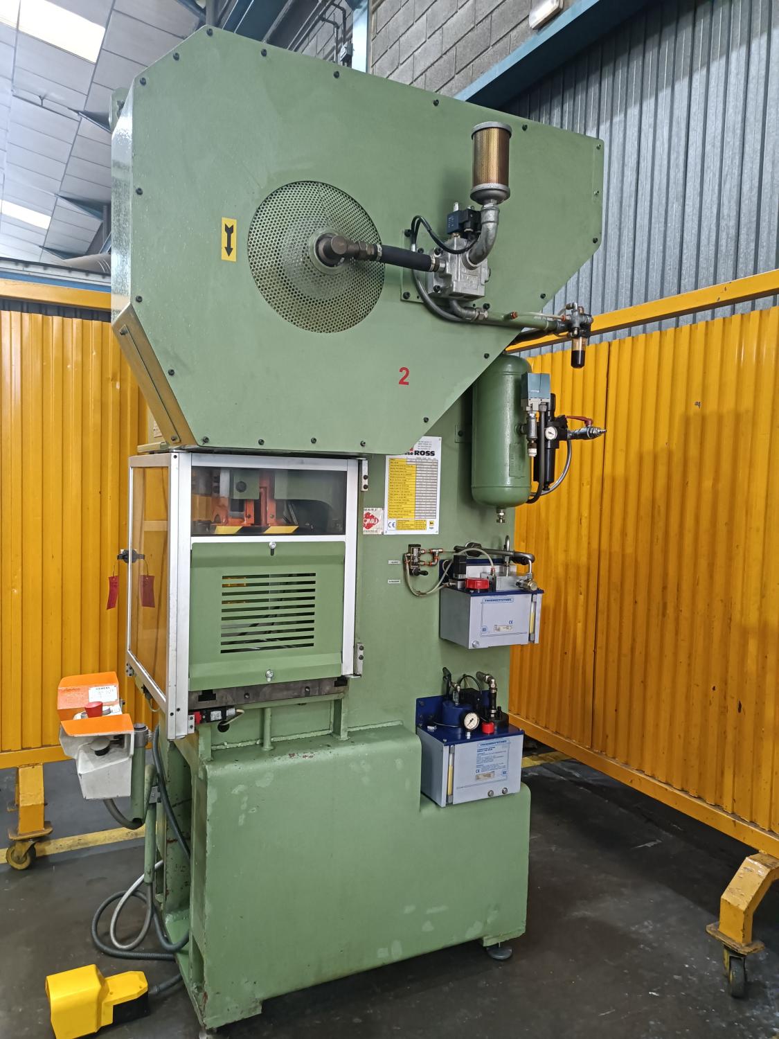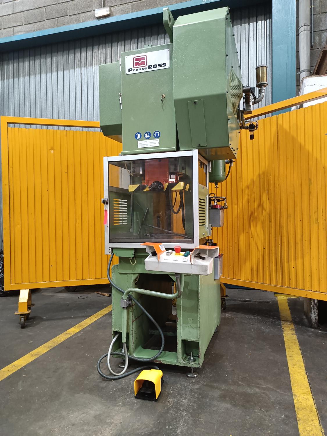 PNEUMATIC CLUTCH PRESS. ROSS. Motor: 3Hp 380V. Tons: 40. Year of manufacture: 2003. Country of origin: Italy. Table: 600x45 mm. Span: 370 mm. Weight: 2,200 Kg. hits/mins: 150. distance between columns: 250. strokes: 7-100 mm. Neckline: 170 mm. Hole in table: Ø120. Hammer surface: 400 x 250. Table height: 820 mm. Accessories: Two-handed and foot operated, hydraulic anti-lock safety device, automatic lubrication, safety screens. Reuse of lubricating oil. Dimensions: 1,000 x 1,000 x 2,350 mm. Almost new condition. With C.E.
